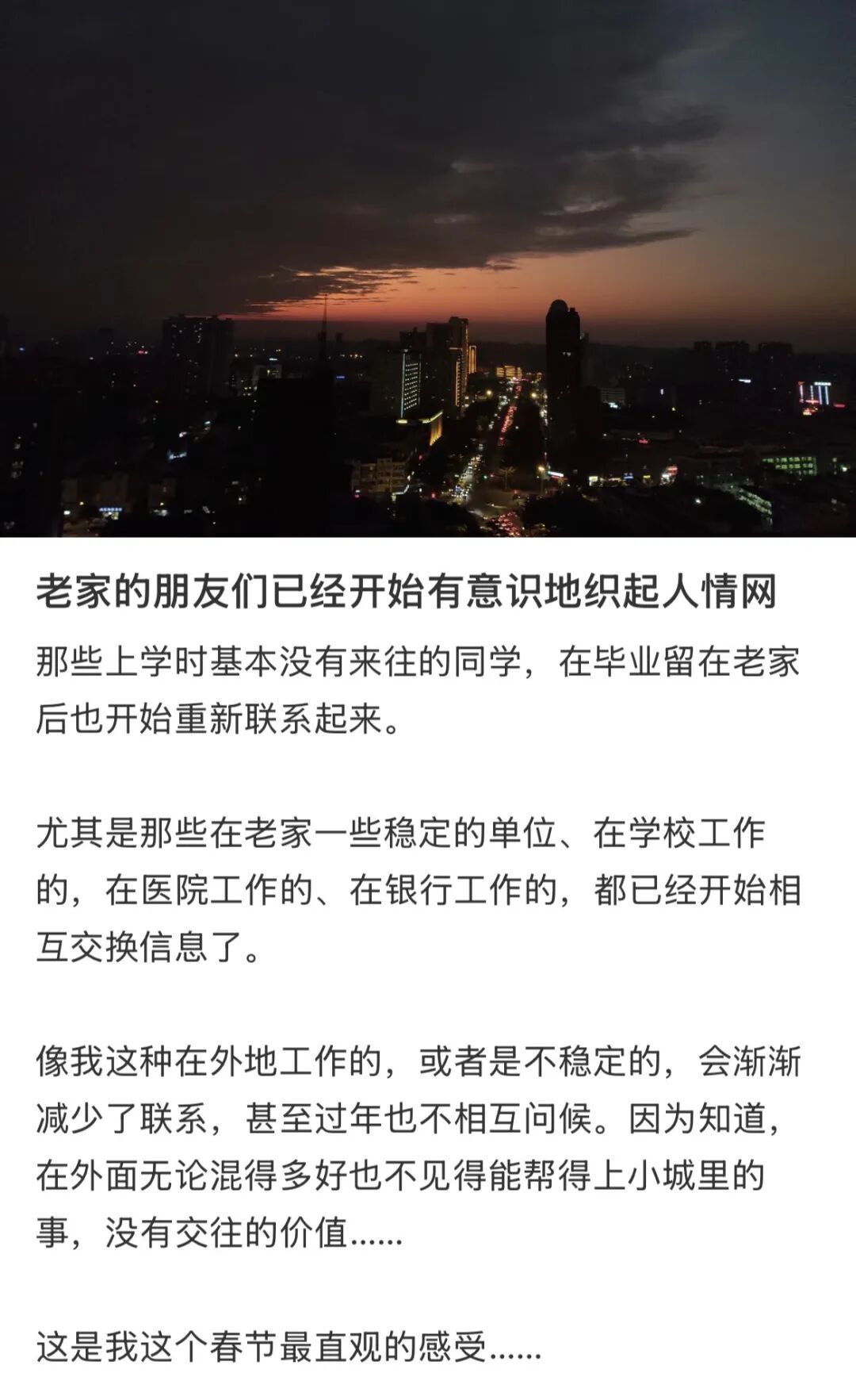 就连同学聚会也成了关系置换的社交场合,人们不再回忆往昔,而是交换起了工作岗位,攀谈起了人情往来。至于从大城市回来的自己,则显得有些格格不入。